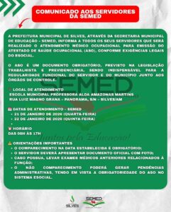 Leia maisCOMUNICADO A Prefeitura Municipal de Silves, por meio da Secretaria Municipal de Educação, informa que será realizado atendimento médico ocupacional...