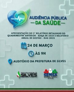 CONVITE À POPULAÇÃO A Secretaria Municipal de Saúde de Silves/AM (SEMSA) convida toda a população para participar da Audiência Pública de Saúde. Na...Leia mais