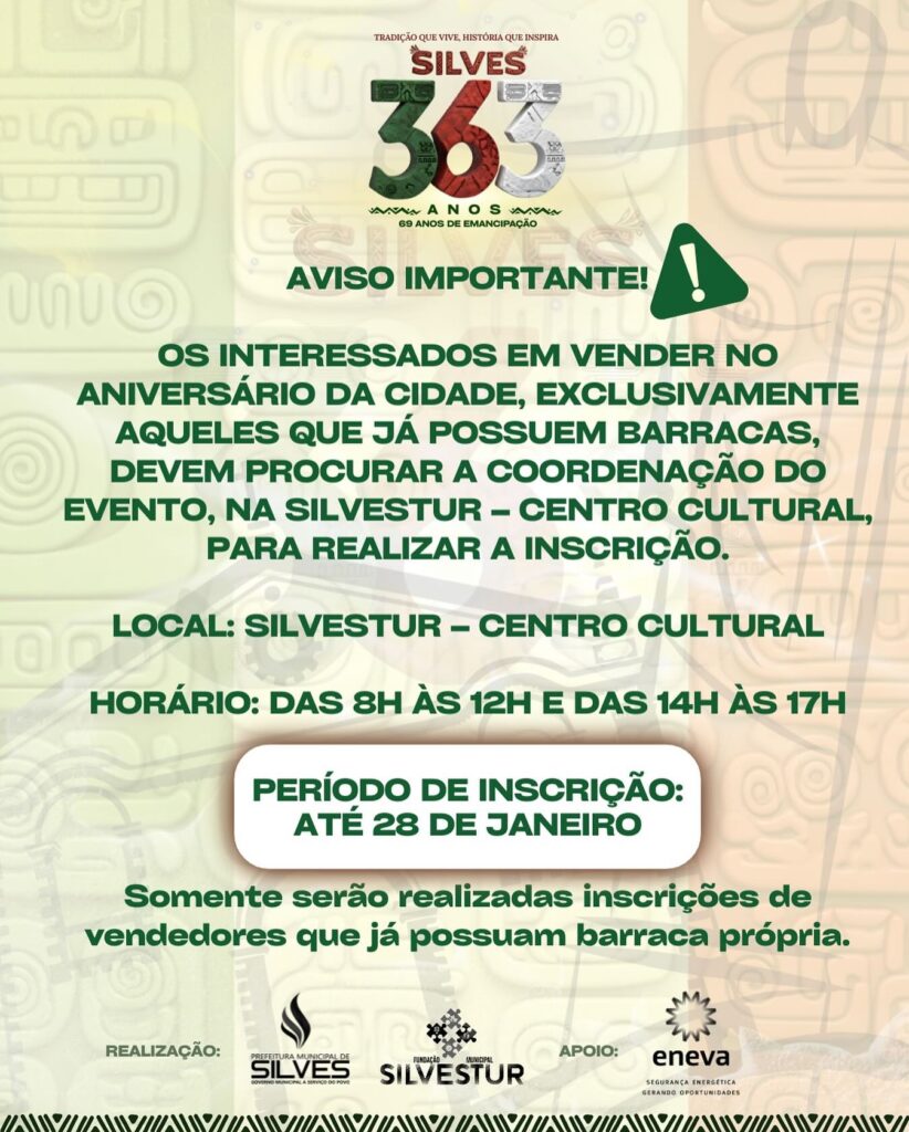 Os interessados em vender no Aniversário da Cidade, exclusivamente aqueles que já possuem barraca própria, devem procurar a Coordenação do Evento para realizar a inscrição.
