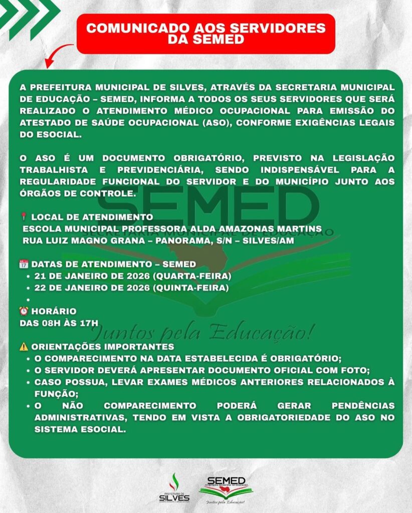 A Prefeitura Municipal de Silves, por meio da Secretaria Municipal de Educação, informa que será realizado atendimento médico ocupacional para emissão do Atestado de Saúde Ocupacional (ASO), documento obrigatório para cumprimento das exigências do eSocial.