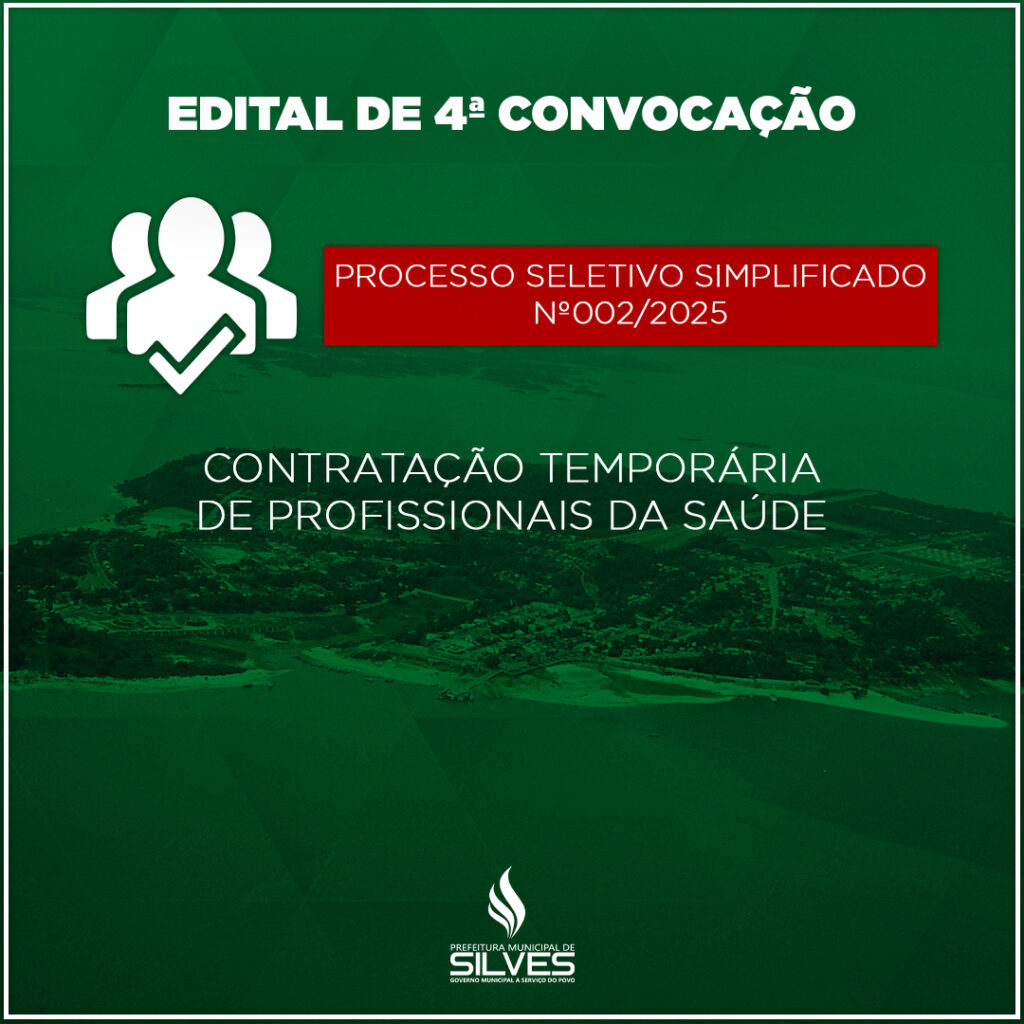 A Prefeitura Municipal de Silves, respeitando o princípio da transparência e da publicidade dos atos municipais, comunica a todos os munícipes a publicação do resultado preliminar do edital do Processo Seletivo Simplificado nº 002/2025 – 4ª convocação, conforme publicação no Diário Oficial dos Municípios e no Portal da Transparência da própria Prefeitura.